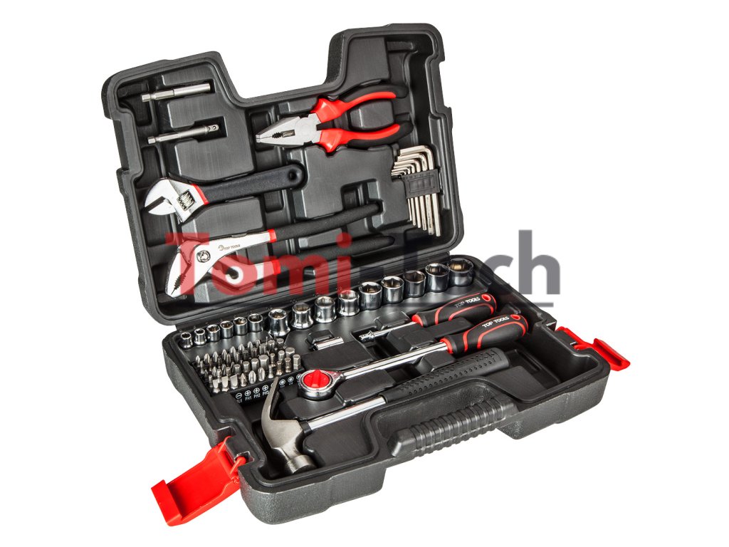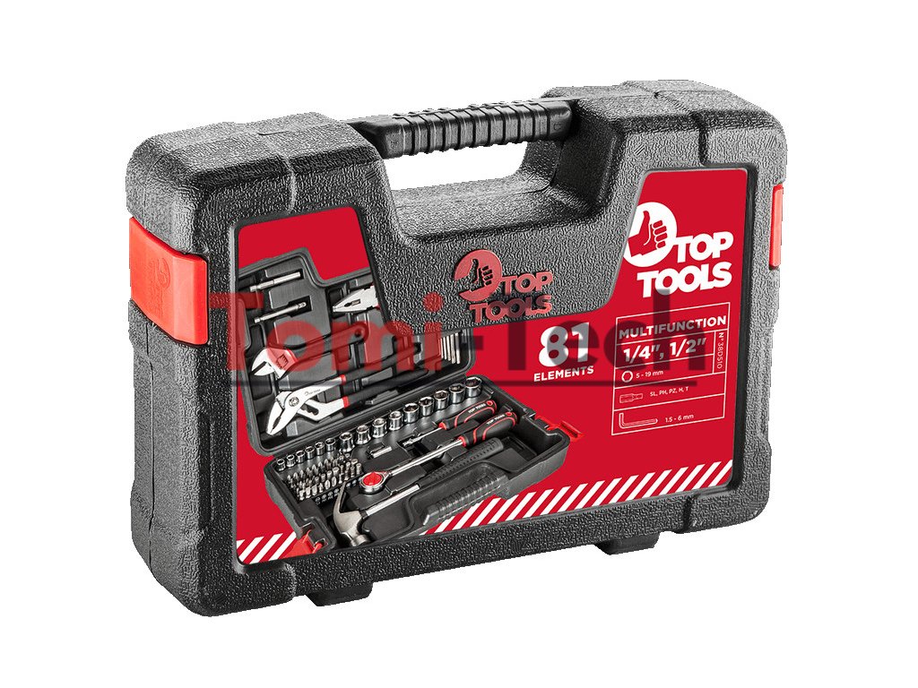 Sada náradia, 81 ks. Materiál uhlíková oceľ. 1/2 račňa, rukoväť skrutkovača, držiak bitov, tesárske kladivo 200 g, imbusové kľúče 7 ks: 1,5, 2, 2,5, 3, 4, 5, 6 mm; kombinované kliešte 160 mm, kliešte na rúry 230 mm, nastaviteľný kľúč 150 mm, adaptér na skrutkovač s bitmi, adaptér na skrutkovač s objímkou, objímky, 9 ks: 10, 11, 12, 13, 14, 15, 16, 17, 19 mm; objímky, 6 ks: 5, 6, 7, 8, 9, 10 mm, bity 25 mm, 40 ks: PZ0, PZ1, 5xPZ2, PZ3, PH0, PH1, 5xPH2, PH3, SL3, SL4, SL4.5, SL5, SL5.5, SL6, SL6.5, SL7, SL8, T8, T10, T15, T20, T25, T27, T30, T40, T45, H1.5, H2, H2.5, H3, H4, H5, H5.5, H6, H8, H1/8, H9/64, H5/32, H3/16, H7/32, H1/4, H5/16.Dodatočné parametre