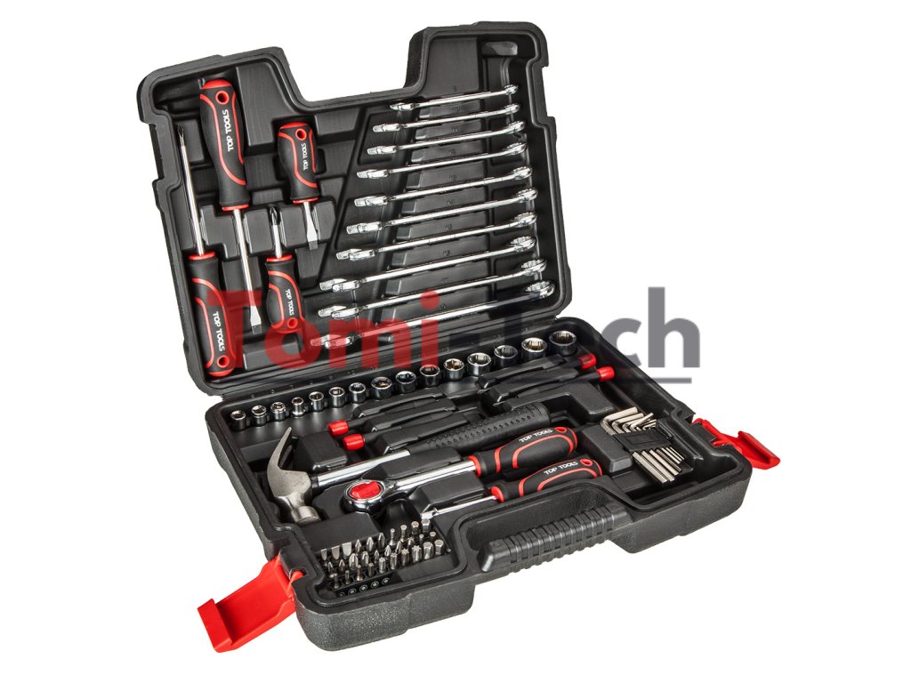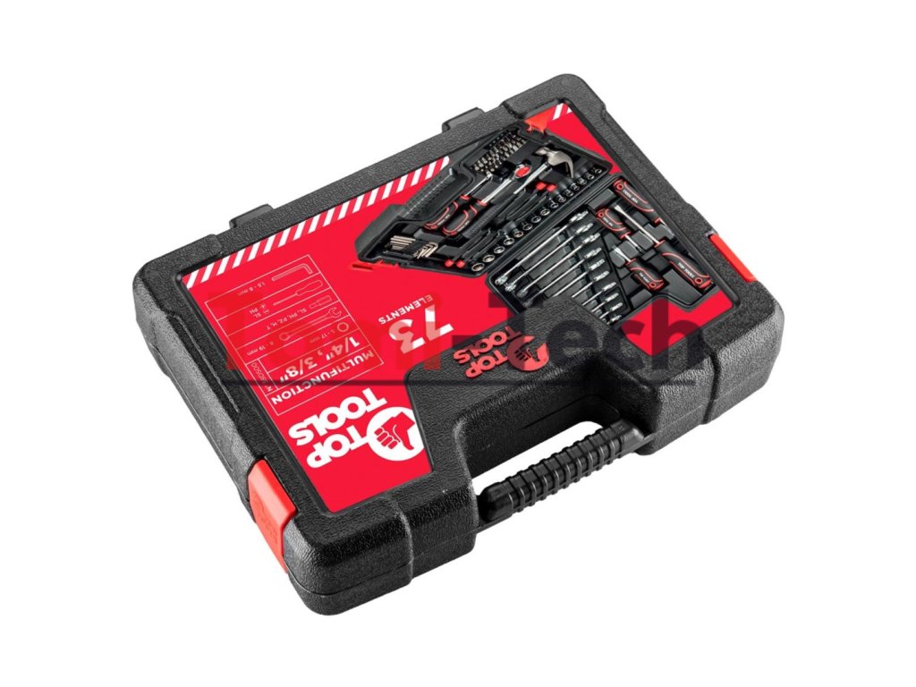 Sada náradia, 3/8, 73 dielov. Materiál uhlíková oceľ. Račňa 3/8, rukoväť skrutkovača, držiak bitov, tesárske kladivo 200 g, 4 presné skrutkovače: PH00, PH0, SL00, SL0, 190 mm skrutkovače, 2 ks: PH2, SL6.5, 100 mm skrutkovače, 2 ks: PH2, SL6; 10 otvorených kľúčov: 8, 10, 11, 12, 13, 14, 15, 16, 17, 19 mm; 7 imbusových kľúčov: 1,5, 2, 2,5, 3, 4, 5, 6 mm; 3/8 objímky, 8 ks: 10, 11, 12, 13, 14, 15, 16, 17 mm; objímky, 6 ks: 5, 6, 7, 8, 9, 10 mm; skrutkovacie bity 25 mm, 30 ks: SL3, SL4, SL4.5, SL5, SL5.5, SL6, SL6.5, SL7, SL8, H3, H4, H5, H6, PH0, PH1, PH2, PH3, PZ0, PZ1, PZ2, PZ3, T8, T10, T15, T20, T25, T27, T30, T40, T45.Dodatočné parametre
