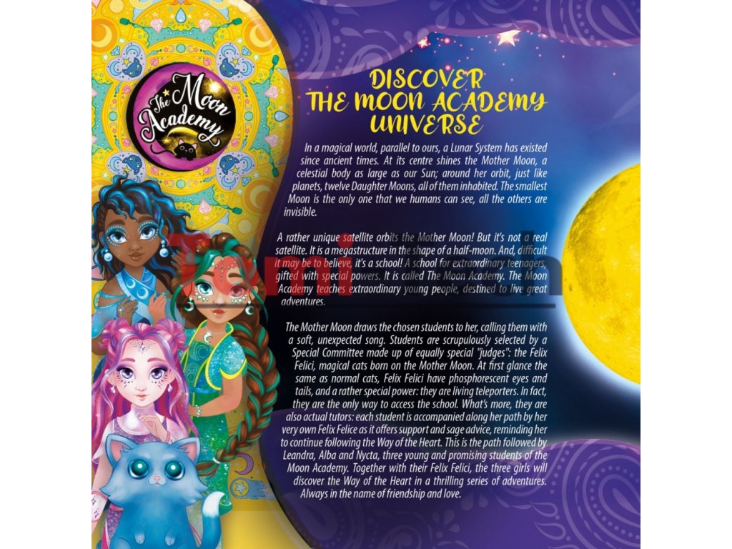 Vstúpte do Moon Academy a pridajte sa k Leandre, Albe a Nycte, našim najlepším študentkám, ktoré vás naučia všetko! S touto sadou sa naučíte, ako vytvoriť Felixa Feliciho, magické mačky z našej magickej školy! Zmiešajte ingrediencie, nalejte ich do formy, počkajte niekoľko hodín a... hotovo! Vaše mačky Felix Felici ožijú akoby mávnutím čarovného prútika.