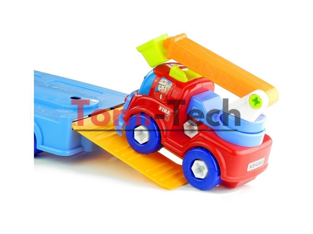 - odťahovky,- hasičské auto. ">- figúrka policajta a vodiča odťahovky,- bezpečnostné značky a stĺpiky,- skrutky a náradie.Rôznofarebná odťahovka sa skladá z dvoch častí: kabíny vodiča s otvormi v mieste okien, vďaka ktorým môžete umiestniť vodiča a spolujazdca, ako aj rozťahovací príves. Zábavné autíčko sedí na štyroch pároch otočných kolies, čo umožňuje deťom hrať sa s prívesom mnohými spôsobmi. Autíčko má prvky pripevnené veľkými plastovými skrutkami, ktoré môže dieťa odskrutkovať pomocou priložených plastových skrutkovačov s vymeniteľnými hrotmi a upraviť tak vozidlo. Na prívese sú umiestnené dve menšie autá – policajné a hasičské. Hasičské auto má pohyblivé a otočné prvky, ktoré značne umocnia zábavu. Vozidlá zdobia nálepky dôstojníkov a cestujúcich, ako aj charakteristické nápisy. Intenzívne, živé farby v kombinácii s aerodynamickými, príjemnými tvarmi dodávajú hračke veľmi hravý charakter.Možnosť voľne odskrutkovať a zoskrutkovať časti všetkých autíčok pomôže vášmu dieťaťu rozvíjať jeho predstavivosť a individualitu, ako aj koordináciu oko-ruka. Vďaka prvkom, z ktorých sa táto sada skladá, vaša ratolesť pochopí princípy používania náradia a bude tiež spokojná, pretože rovnako ako otecko bude mať vlastnú, bezpečnú súpravu.Táto sada pre nadšenca cestných vozidiel bude fungovať v rôznych podmienkach. Vyrobené z najkvalitnejšieho plastu, umožňuje hru doma, na pieskovisku, v záhrade alebo na ihrisku. Veľkou výhodou tejto sady je množstvo prvkov, vďaka ktorým sa dá jednoducho zdieľať so súrodencami. Pestrofarebný set zložený z vozidiel a náradia je určený pre všetky deti od 3 rokov. Hračka je certifikovaná CE a spĺňa normu EN 71, čo zaručuje bezpečnú hru.Rozmery vybraných prvkov súpravy: