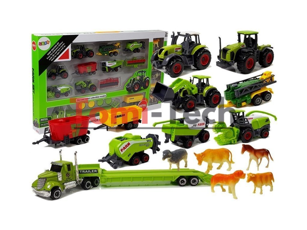 Sada poľnohospodárskych vozidiel, traktorov, prívesov a figúrok zvierat
