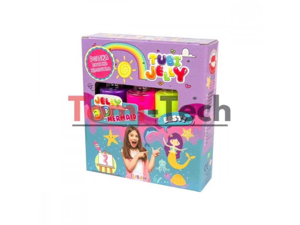 Tubi Jelly je nová plastelína, ktorá v kombinácii s vhodným aktivátorom umožňuje vytvárať trojrozmerné figúrky s gélovou konzistenciou. Pozrite sa, ako jednoducho zmeniť konzistenciu z tekutej na tuhú. Zaujímavá sada pre zvedavé a kreatívne mysle. Sada obsahuje šablóny s motívmi morskej panny a jej morských priateľov. Na výber máme širokú paletu gélových tekutín - 18 rôznych farieb (vrátane neónov, trblietok a magického gélu svietiacej v tme). Gélové tekutiny sa predávajú samostatne.