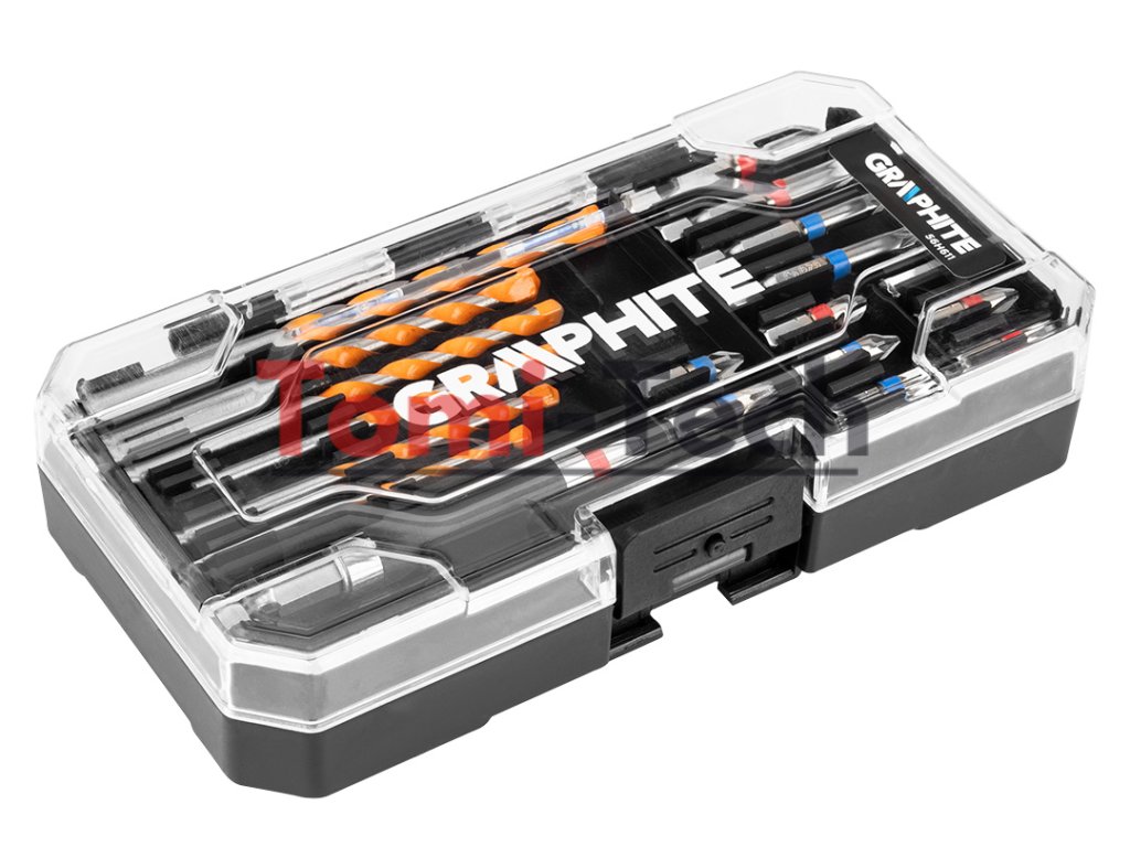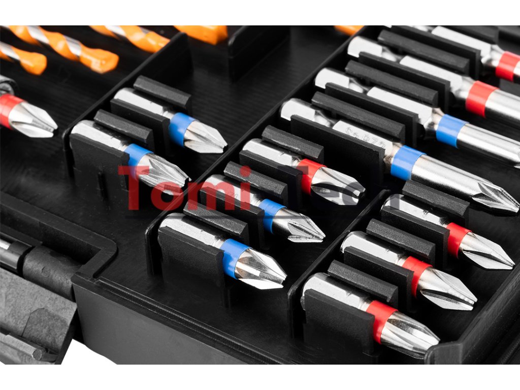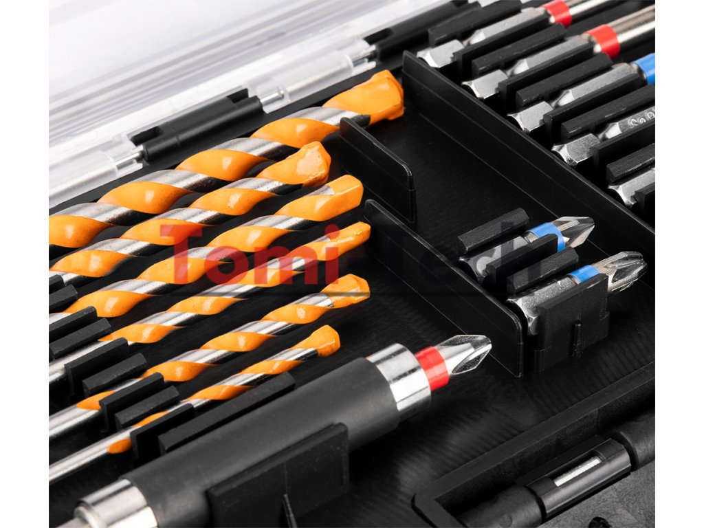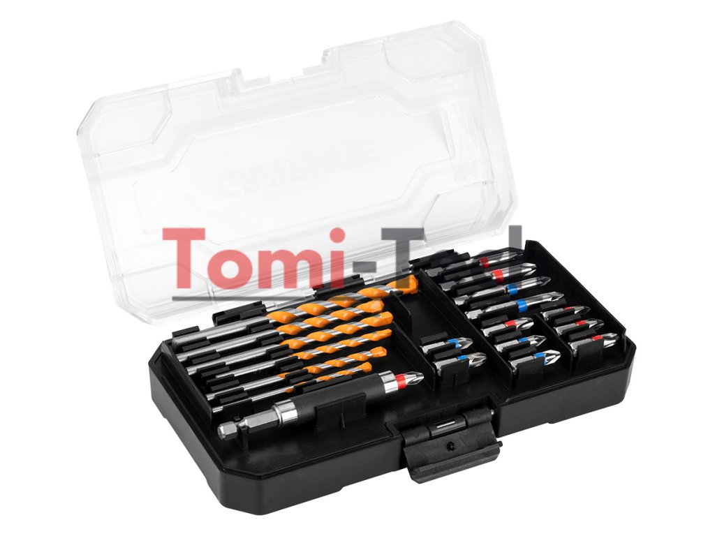 Sada vrtákov a bitov, 20 ks. vrtáky do betónu, 6 ks: 4, 5, 5,5, 6, 7, 8 mm; 25 mm bitov, 9 ks: PH 1/2x2/3x2 mm; PZ 1/2x2/3 mm; 50 mm bitov, 4 ks: PH 1/2 mm; PZ 1/2 mm; držiak bitov, 1 ks.Dodatočné parametre