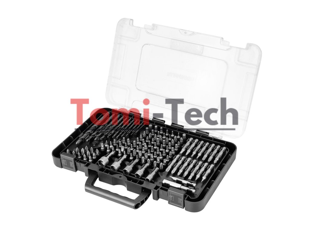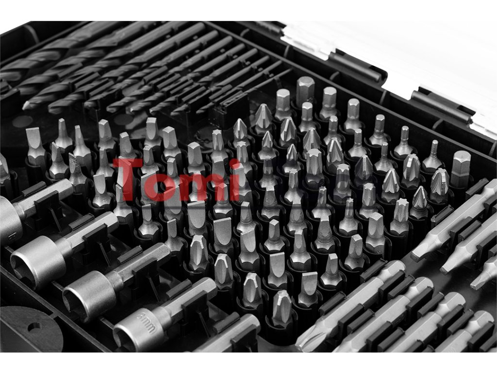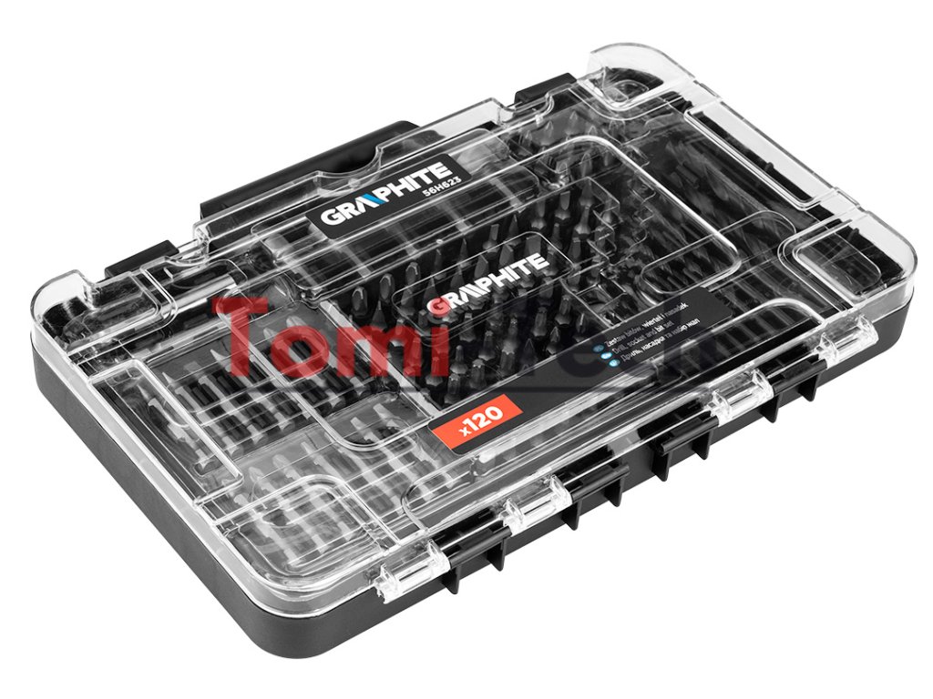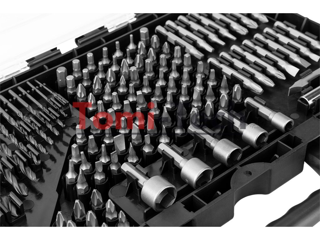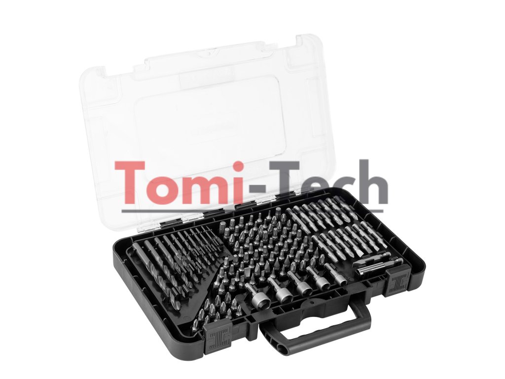 Sada vrtákov a bitov, 120 ks - vrtáky do kovu, 11 ks: 1,5, 2, 2,5, 3, 3,2, 3,5, 4, 5, 6, 6,5, 8 mm; bity 25 mm, 88 ks: SL 3x3/4x3/5x4/6x4/7x1 mm; PH 0x3/1x3/2x6/3x4 mm; PZ 0x2/1x2/2x6/3x2 mm; TX 10x2/15x2/20x2/25x2/27/30 mm; HEX 2x2/2,5x2/3x2/4x2/5x2/6x2 mm; Q 0x3/1x8/2x6/3x6; bity 50 mm, 15 ks: SL 3/4/5/6/7 mm; PH 1/2/3 mm; PZ 1/2/3 mm; Q 1/1/2/3 mm; hroty, 5 ks: 6, 8, 10, 11, 13 mm; magnetický držiak bitov 60 mm, 1 ks.Dodatočné parametre