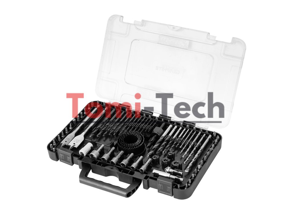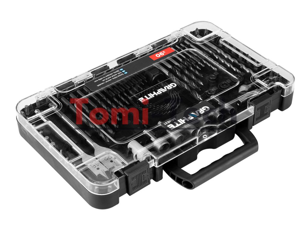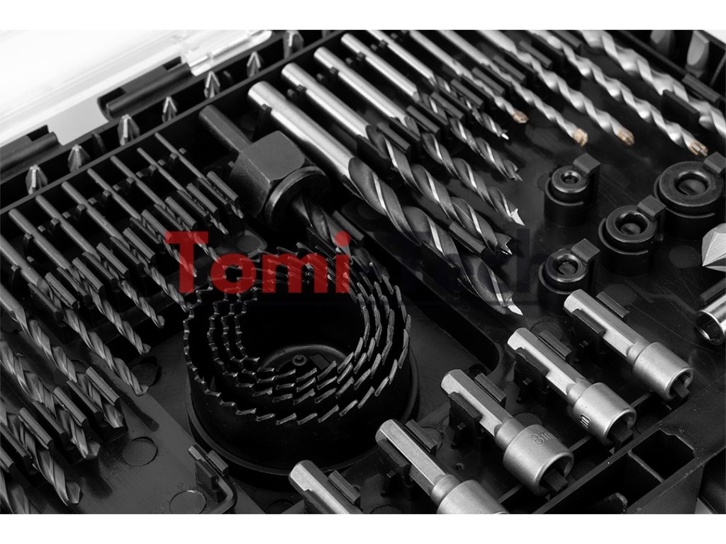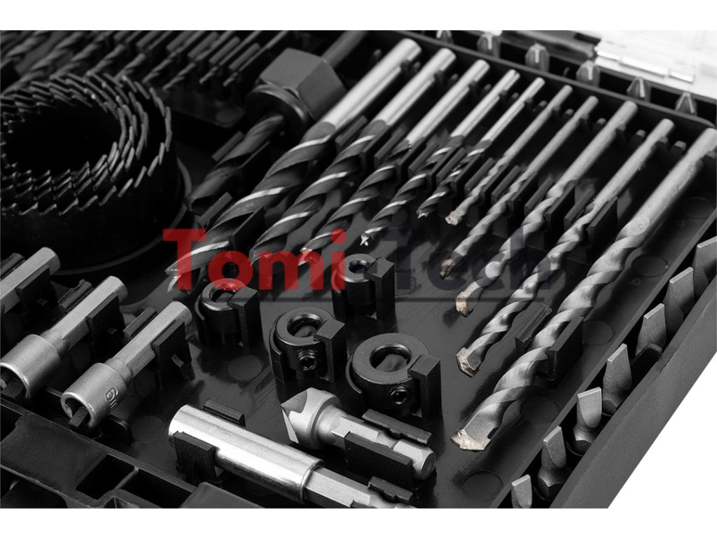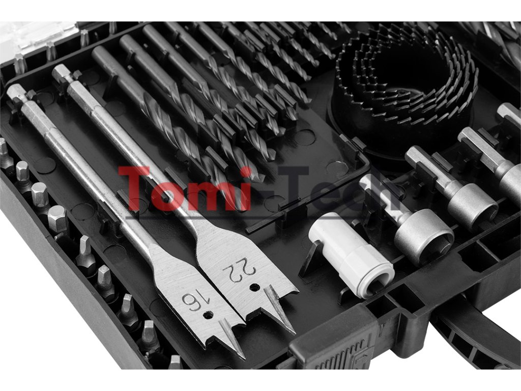 Sada vrtákov a bitov, 90 ks - vrtáky do kovu, 13 ks: 1,5x2/2x2/2,5x2/3/3,5/4/4,5/5/6/6,5 mm; vrtáky do dreva, 5 ks: 3, 4, 5, 6, 8 mm; vrtáky do betónu, 5 ks: 3, 4, 5, 6, 8 mm; ploché vrtáky do dreva, 2 ks: 16, 22 mm; vrtáky 25 mm, 46 ks: SL 3x2/4x2/5x2/6x2/7x2 mm; PH 1x2/2x4/3x3 mm; PZ 1x3/2x4/3x2 mm; TX 10/15/20/25/27/30 mm; HEX 2/3/4/5/6 mm; Q 1x2/2x3/3x2 mm; dierové píly 4 ks: 32, 38, 45, 54 mm; adaptér s vrtákom, 1 ks; hroty 6 ks: 6, 7, 8, 9, 10, 12 mm; magnetický držiak 1 ks; dorazy vrtákov 4 ks: 3, 5, 6, 8 mm; adaptér, 1 ks; vrták na zrážanie hrán, 1 ks; imbusový kľúč, 1 ks.Dodatočné parametre