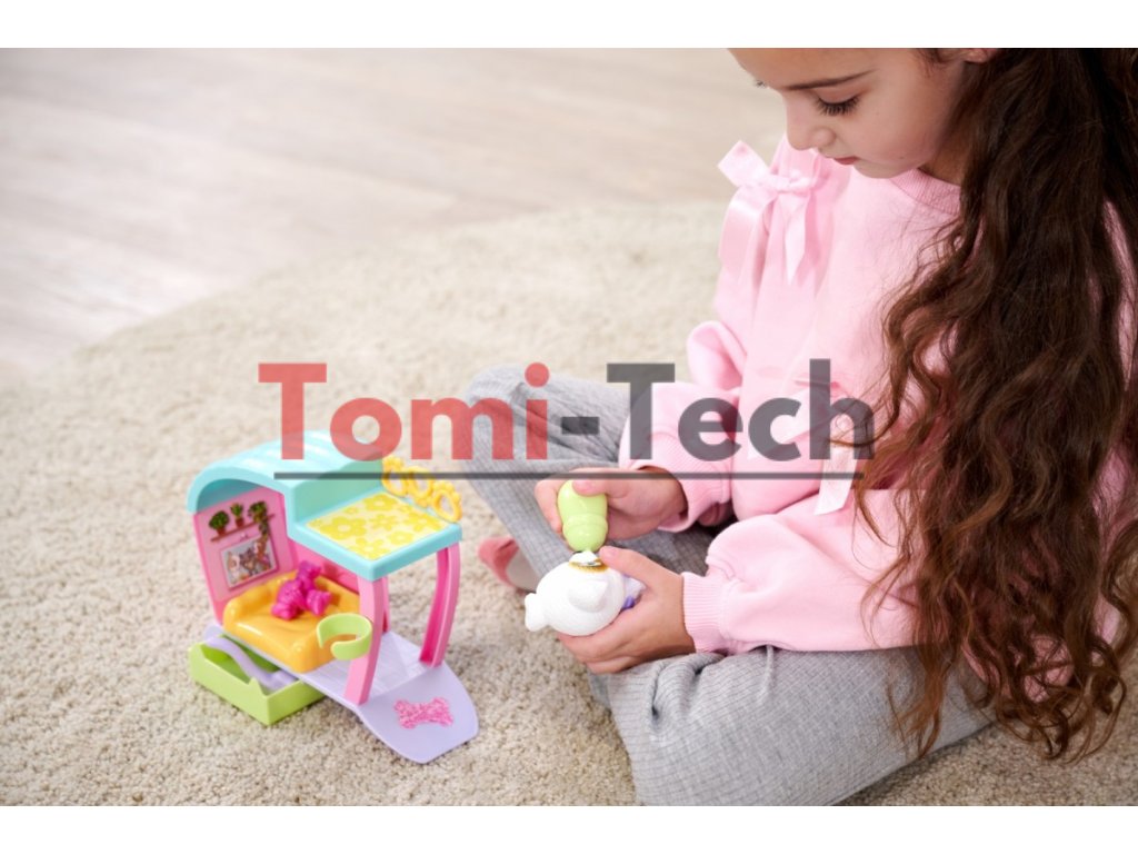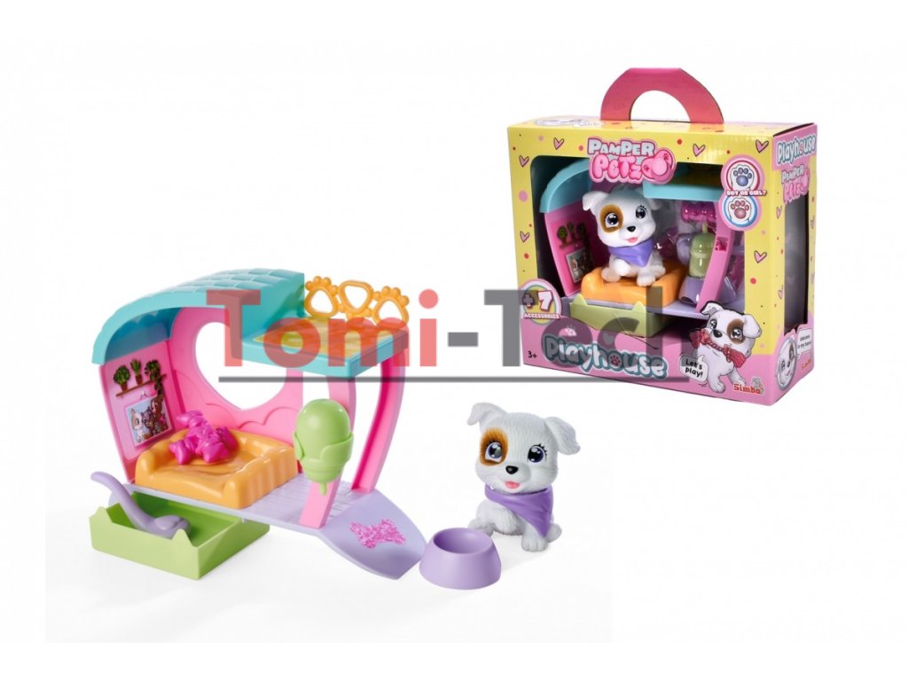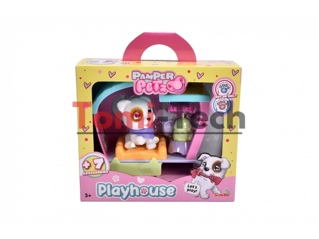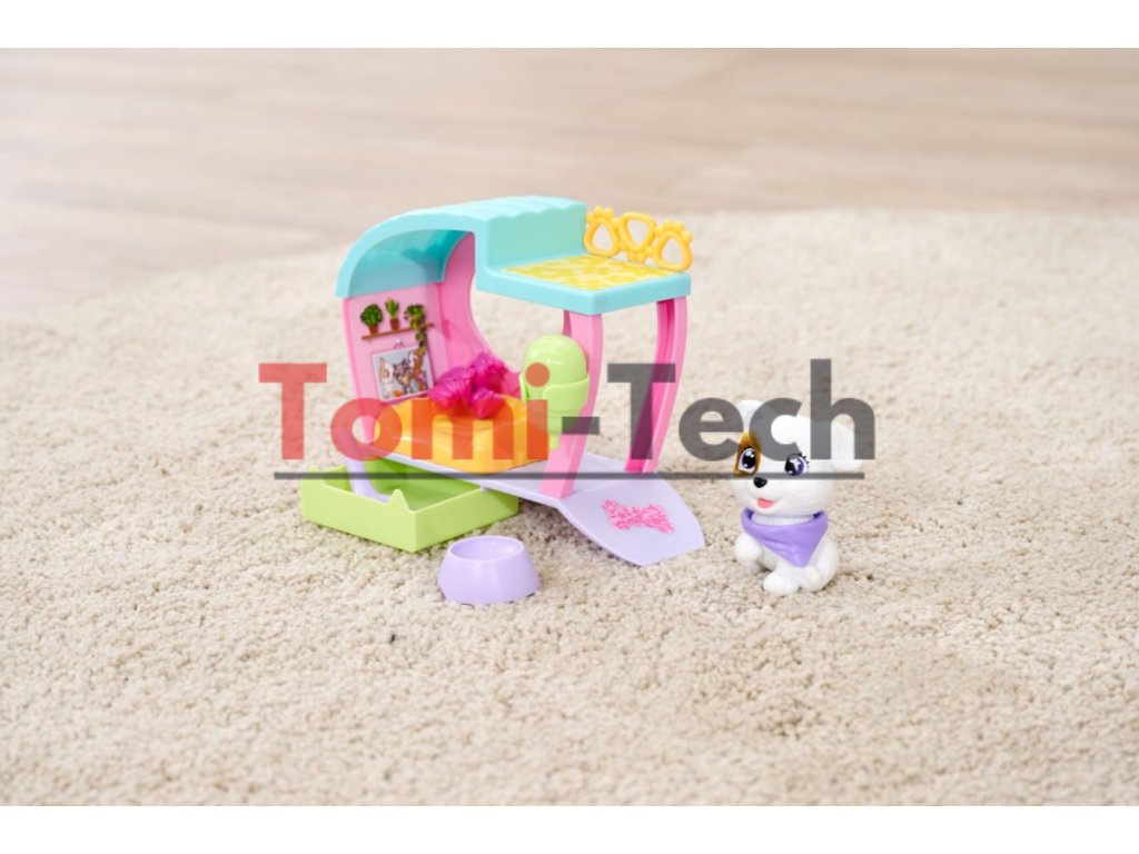 Domček so psíkom a rôznymi doplnkami na starostlivosť a hranie vrátane kefky, kosti, fľaše na pitie a misky. Pred otvorením neviete, či je to chlapec alebo dievča (ružová alebo modrá labka). Vhodné pre všetky sady PamperPetz Mini. Výška domčeka: 16 cm.