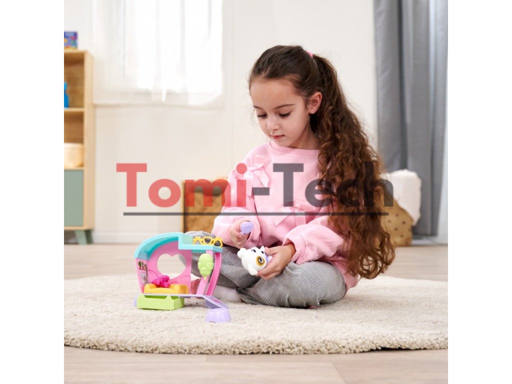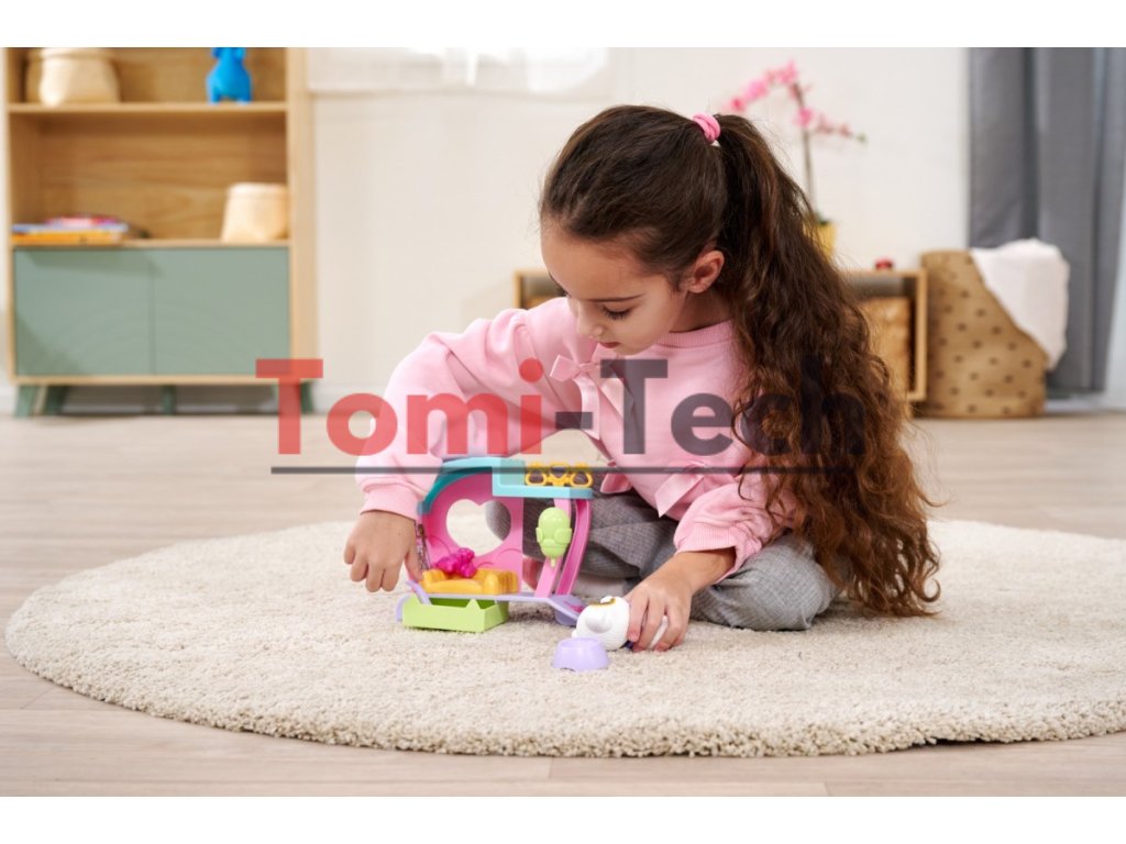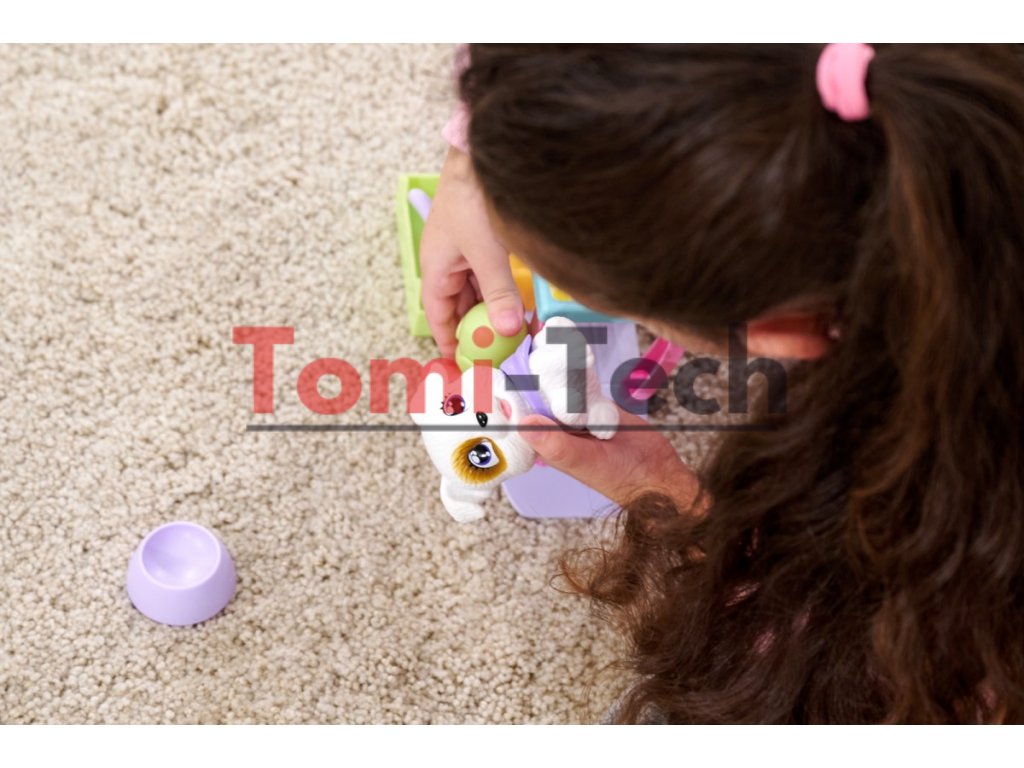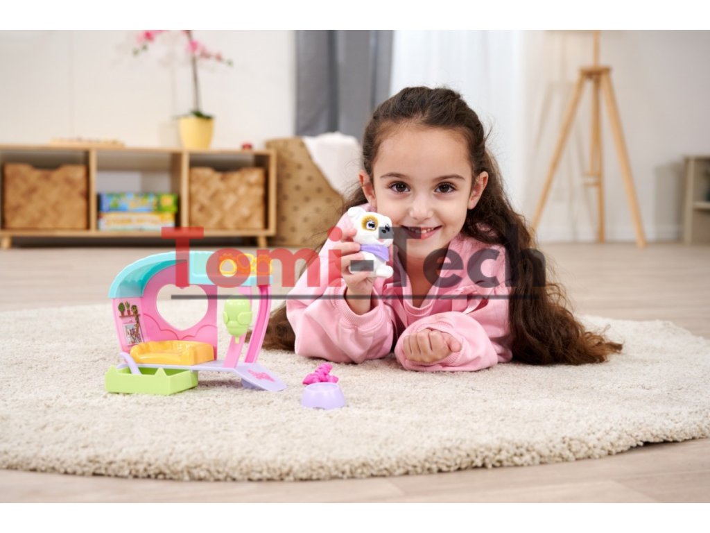 Domček so psíkom a rôznymi doplnkami na starostlivosť a hranie vrátane kefky, kosti, fľaše na pitie a misky. Pred otvorením neviete, či je to chlapec alebo dievča (ružová alebo modrá labka). Vhodné pre všetky sady PamperPetz Mini. Výška domčeka: 16 cm.