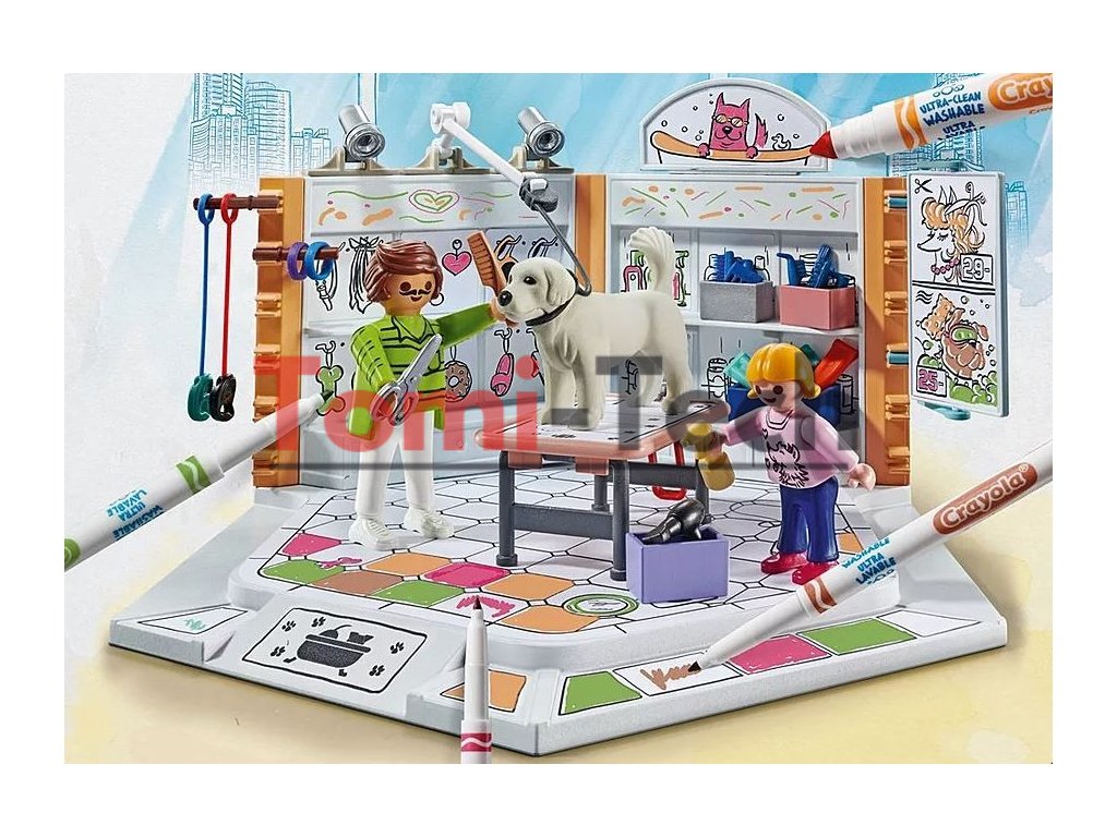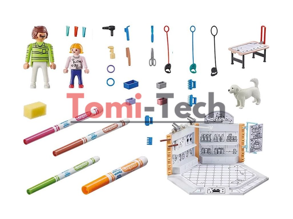 Prebuďte v sebe umelca s farebným salónom pre psov PLAYMOBIL! Malí dizajnéri môžu byť kreatívni a vyfarbiť obchod, psa a špeciálne potiahnuté nálepky a potom ich jednoducho zmyť vodou pre nekonečnú zábavu. Skladací stôl a vodítko poskytujú realistickú hru a pohyblivé časti uľahčujú kefovanie. Poličky poskytujú priestor na príslušenstvo a produkty na starostlivosť o srsť, zatiaľ čo pes s pohyblivou hlavou a ňufákom čaká na svoj rad. Súčasťou balenia je špongia na opravy. Objavte radosť z vyfarbovania a navrhovania s farebným salónom PLAYMOBIL – nekonečná zábava pre kreatívne deti!