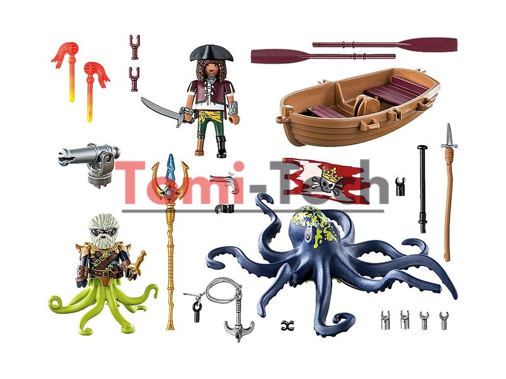 Obrovská chobotnica má funkciu striekania vody. Pirátska loď pláva a má miesto pre figúrku PLAYMOBIL.