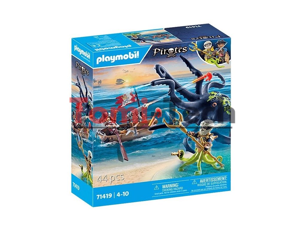 Pozor, pretože k vám pláva obrovská chobotnica! Pirát sa snaží uniknúť v veslici, ale obrovská chobotnica a jej spoločník Deeper sú rýchlejší. Hneď ako loď dobehnú, chobotnica pirátovi dá studenú sprchu striekaním vody zo svojich chápadiel. Pirát nemá čas nabiť delo. Najlepšie je sa s týmto nezvyčajným morským tvorom nezahrávať! Vďaka nápaditým figúrkam a detailným prvkom ponúkajú sady PLAYMOBIL Pirates hodiny zábavy pre fanúšikov pirátov od 4 rokov.