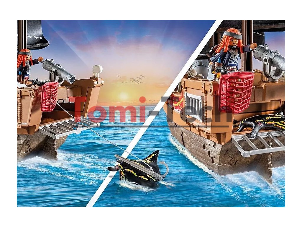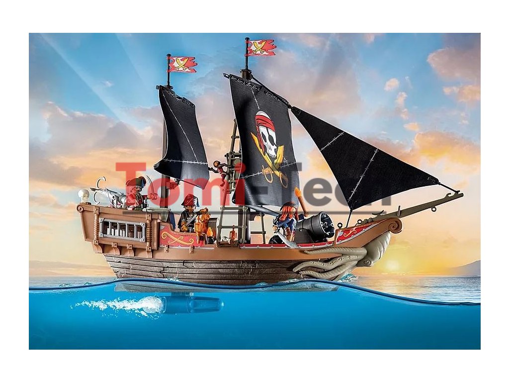 Pozor, fanúšikovia pirátov: Vydávame sa na vzrušujúcu plavbu s veľkou pirátskou loďou PLAYMOBIL! Plávajúca loď je vybavená rotujúcimi kanónmi, veľkým kanónom, ktorý sa dá voľne umiestniť, a ponúka dostatok priestoru pre pirátsku posádku. Praktické nožné svorky umožňujú figúrkam bezpečne stáť na palube. Loď má pohyblivé plachty a plachty sa dajú vysunúť na obe strany. Vstavaný vztlakový prvok zabraňuje potopeniu paluby, aj keď je úplne naplnená vodou.