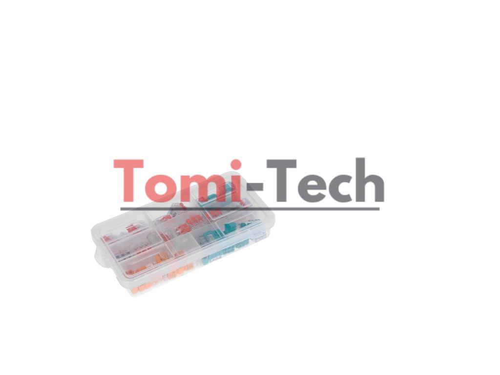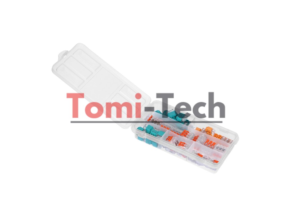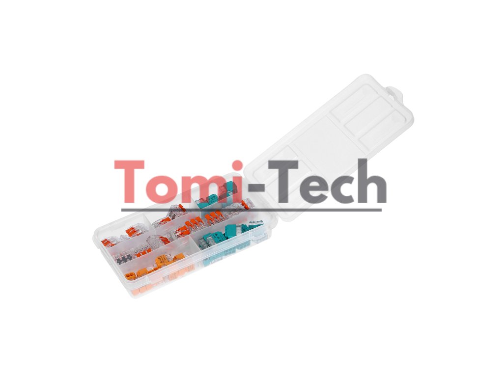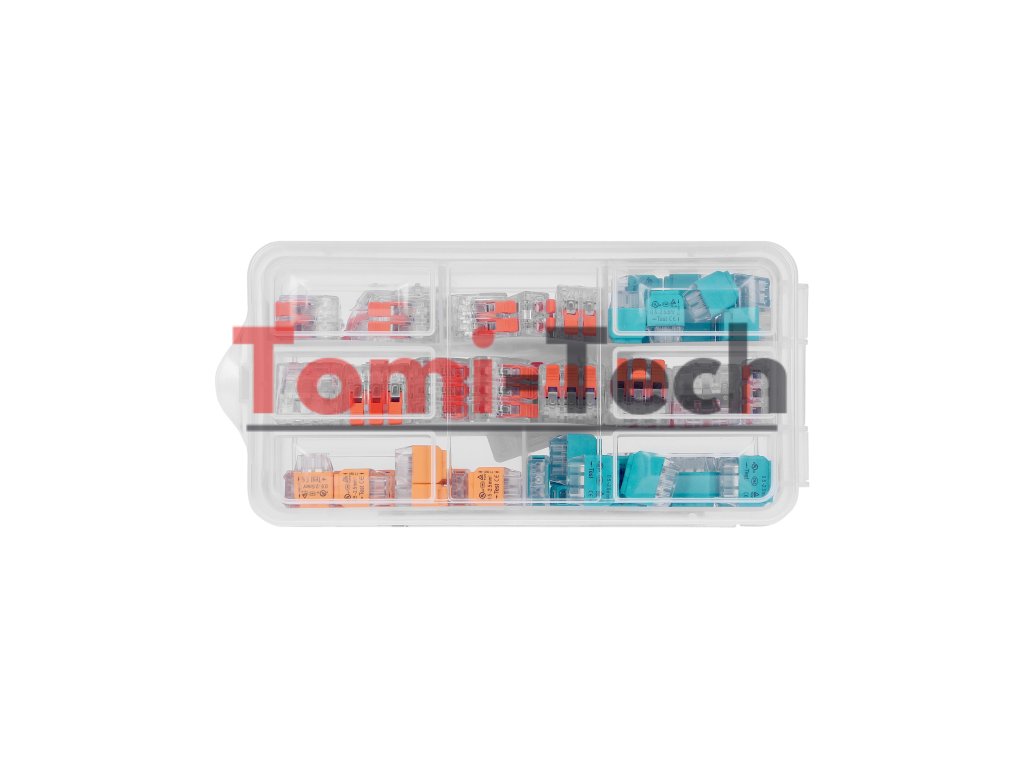 Sada inštalačných konektorov pre byt, 65 ks. Zasúvacie: 15x 2-vodičové, 15x 3-vodičové, 10x 4-vodičové. Upínanie: 10x 2-vodičové, 15x 3-vodičové.